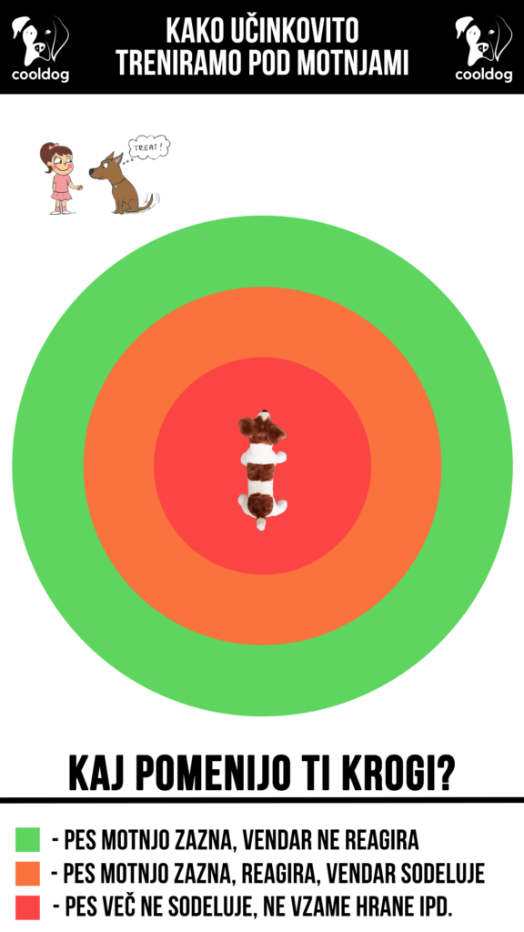 Pri iskanju te razdalje moramo vedno začeti iz zunanje strani, se pravi pričnemo na večji razdalji, ki jo postopoma zmanjšujemo. Ob tem pa spremljamo vedenje psa. V okolici motnje (v našem primeru je to drug pes) si v mislih zarišemo tri cone: